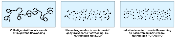 Sommige flesvoedingen voor zuigelingen en opvolg-flesvoedingen zijn gedeeltelijk gehydrolyseerd. Zelfs al zijn de koemelkeiwitketens in deze flesvoedingen gedeeltelijk afgebroken (of gehydrolyseerd), ze zijn nog steeds groot genoeg om allergische reacties te veroorzaken bij baby’s met koemelkallergie. Als gevolg daarvan zijn ze niet hypoallergeen en zijn dus niet geschikt voor zuigelingen met koemelkallergie.